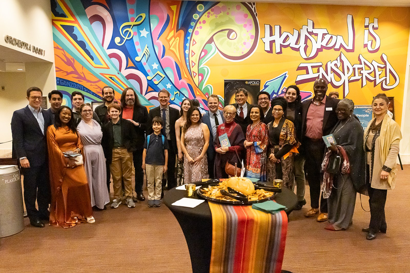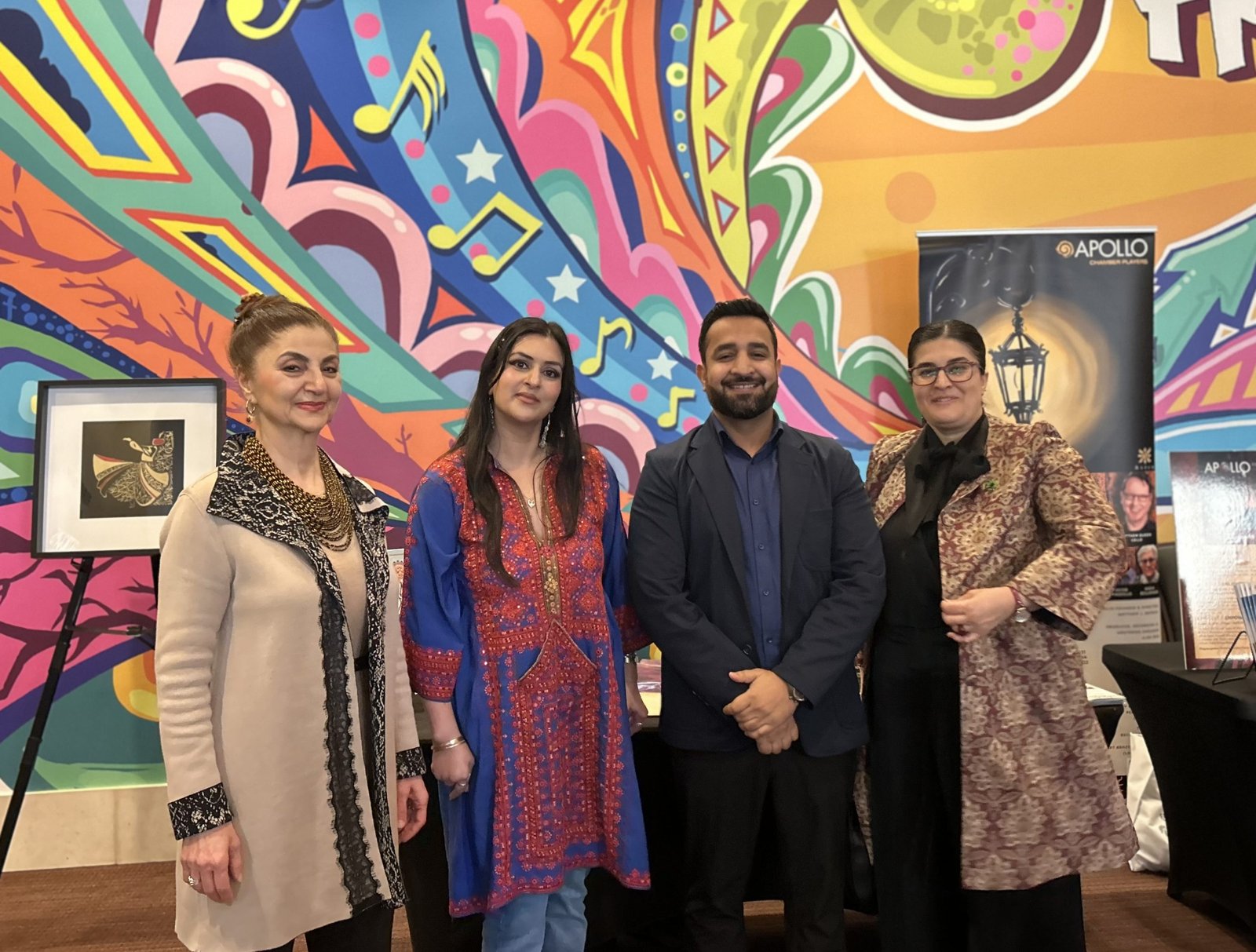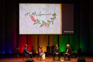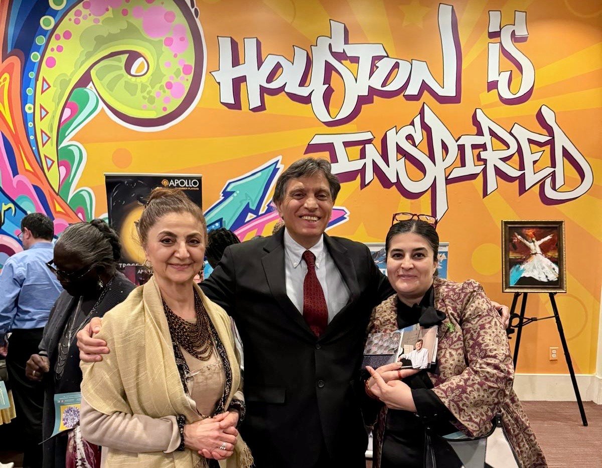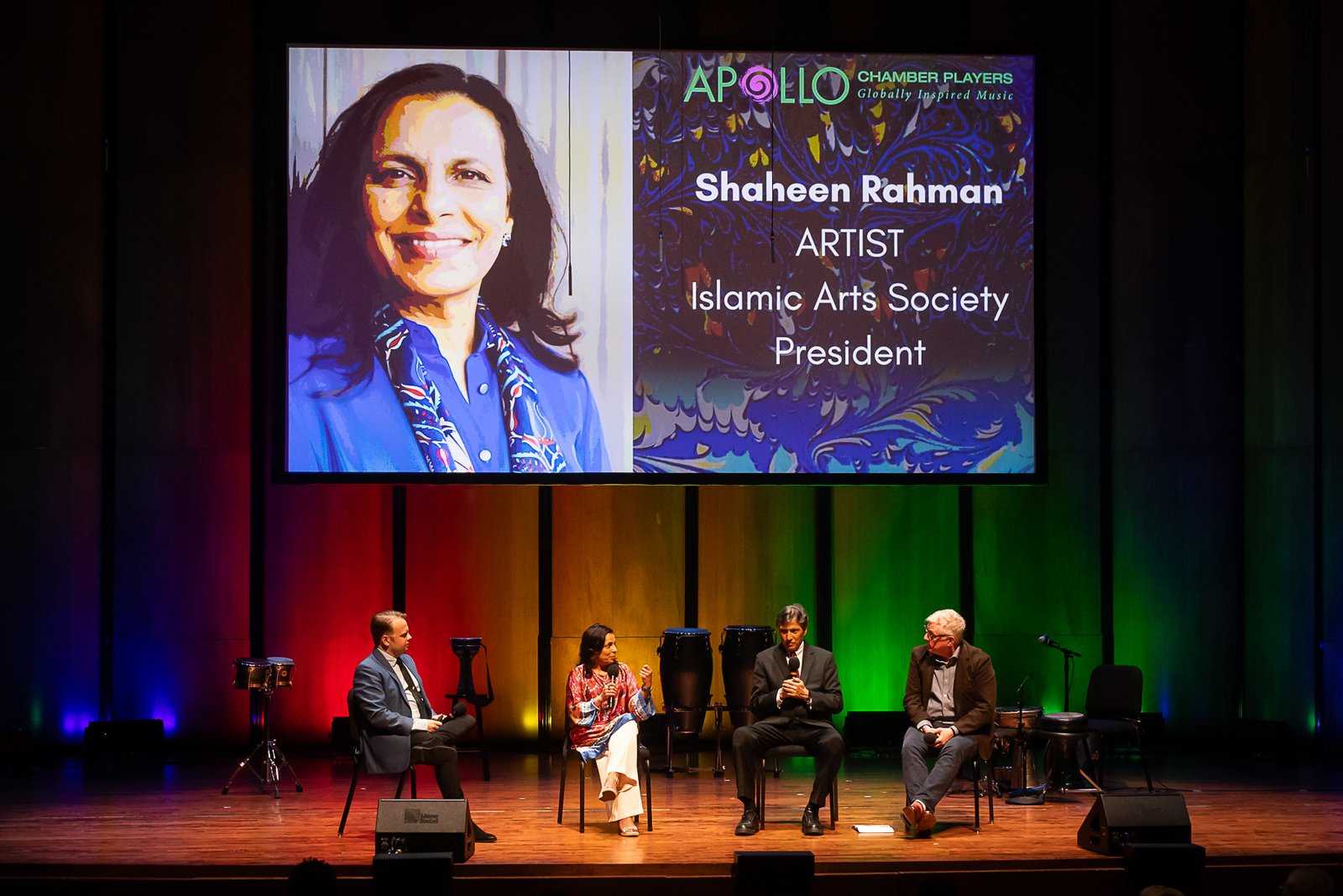 Chamber Music America’s 2025 Ensemble of the Year, the Apollo Chamber Players, invited the Islamic Arts Society to partner with them for an evening of dialogue, visual arts, and music to celebrate Houston’s multicultural landscape. IAS President, Shaheen Rahman proudly represented the Islamic Arts Society in explaining the mission and work of Islamic Arts Society to this public event audience as part of a pre-concert panel discussion. The panel was moderated by St. John Flynn, former Arts and Culture Director of Houston Public Media, and included Apollo’s founding Director Matthew Detrick, and worldclass composer, Professor Reza Vali of Carnegie Melon University, IAS artists featured live Arabic calligraphy and a curated Islamic arts display for the audience in the Zilkha Hall front lobby. Art curated by Gail Mebane.