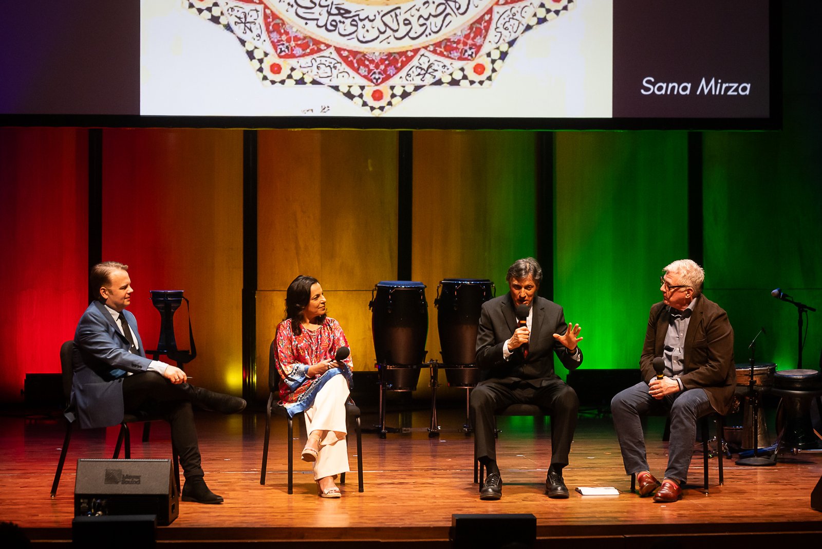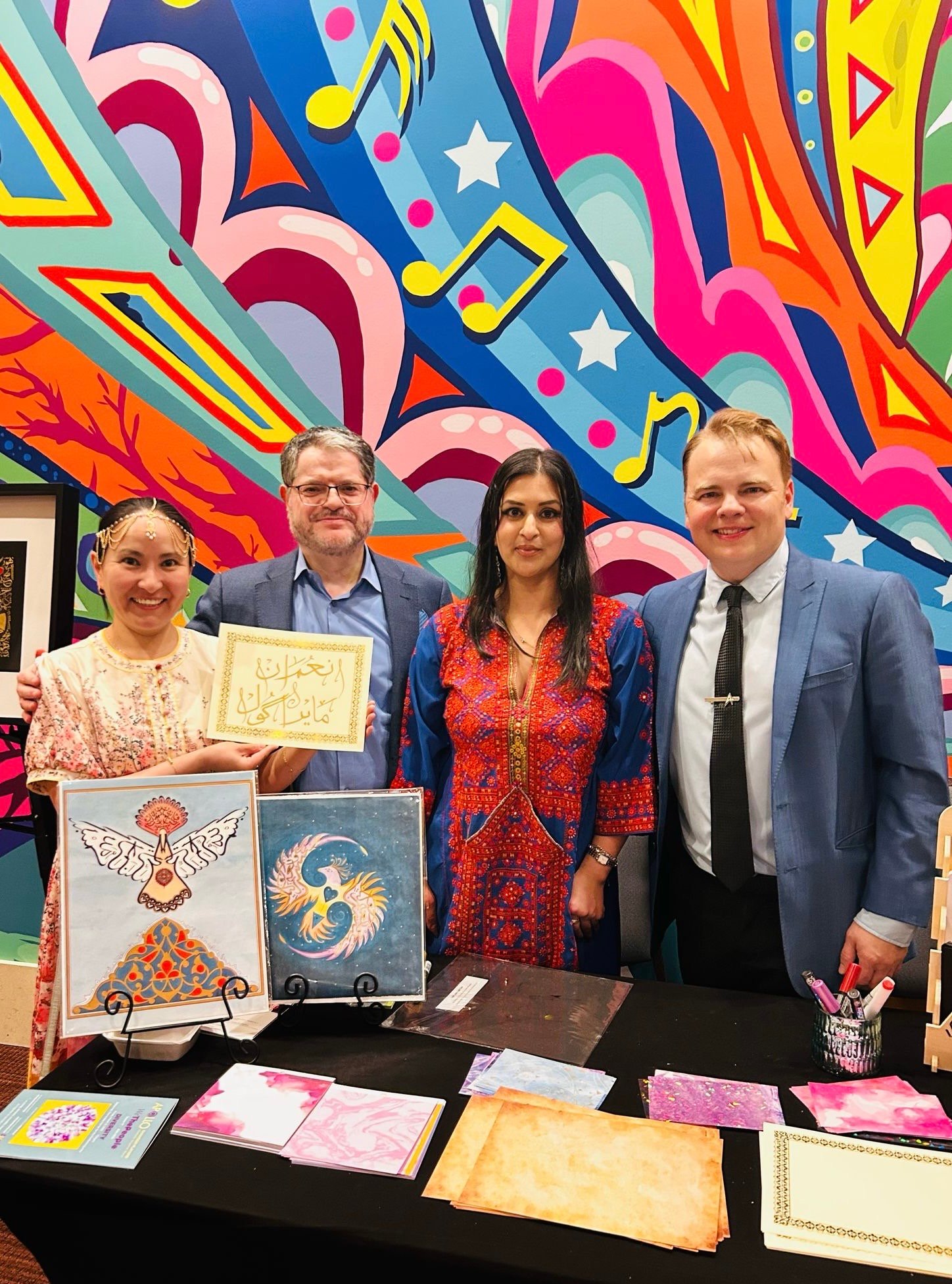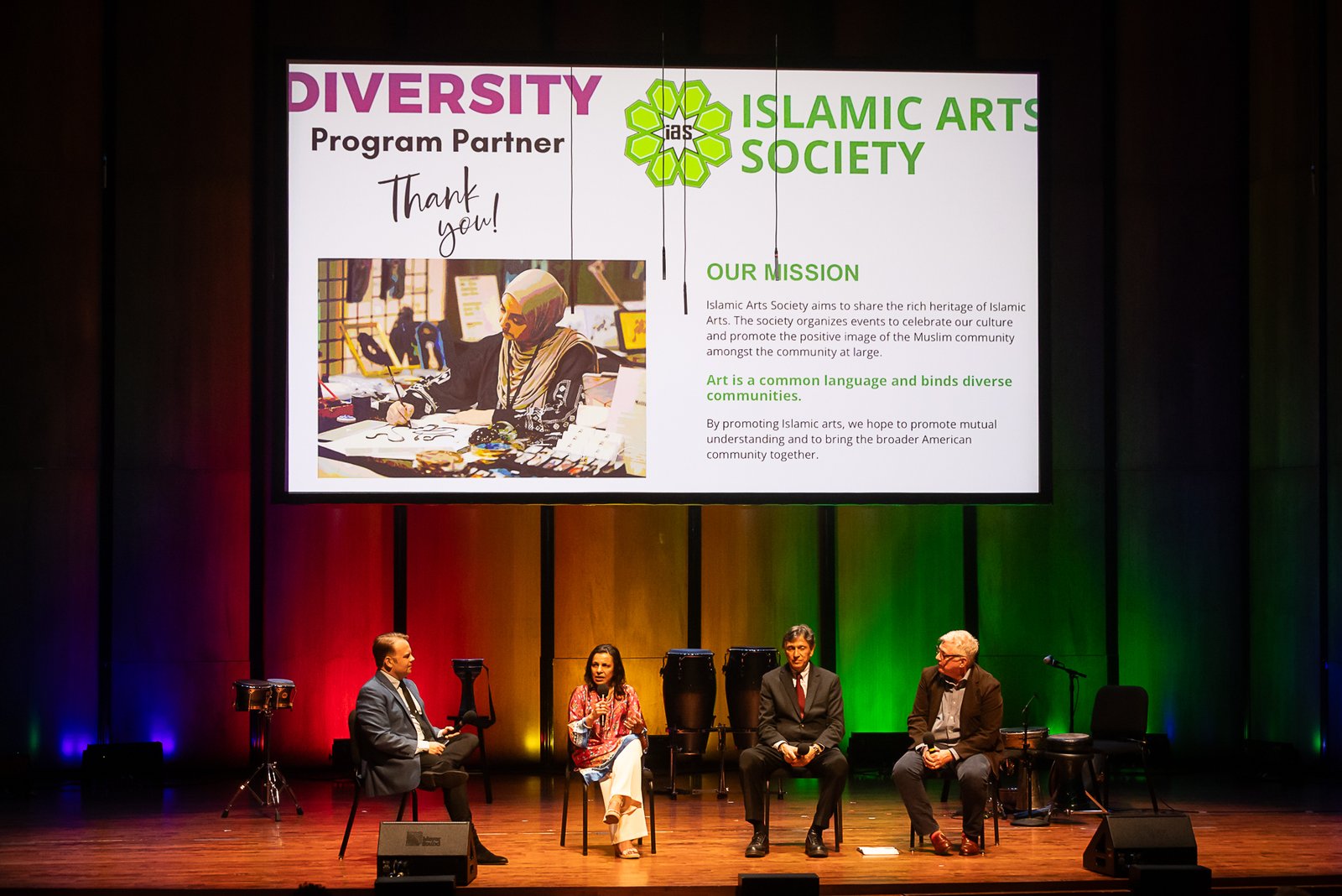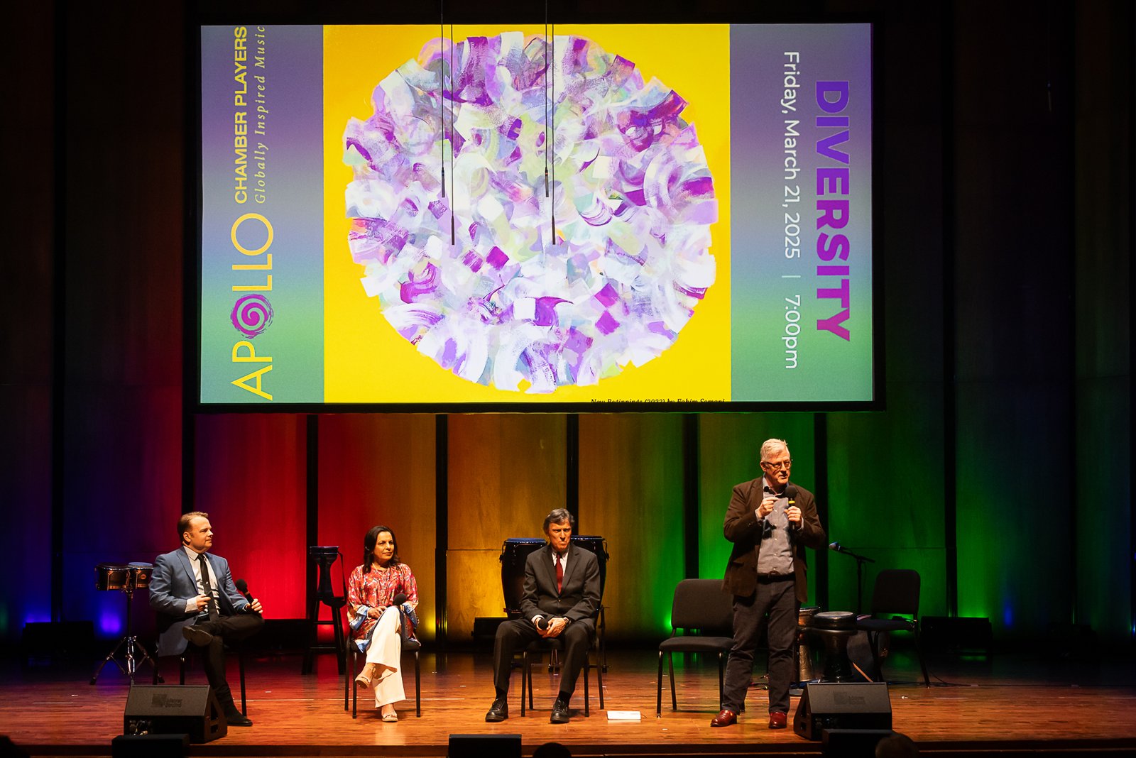 Chamber Music America’s 2025 Ensemble of the Year, the Apollo Chamber Players, invited the Islamic Arts Society to partner with them for an evening of dialogue, visual arts, and music to celebrate Houston’s multicultural landscape. IAS President, Shaheen Rahman proudly represented the Islamic Arts Society in explaining the mission and work of Islamic Arts Society to this public event audience as part of a pre-concert panel discussion. The panel was moderated by St. John Flynn, former Arts and Culture Director of Houston Public Media, and included Apollo’s founding Director Matthew Detrick, and worldclass composer, Professor Reza Vali of Carnegie Melon University, IAS artists featured live Arabic calligraphy and a curated Islamic arts display for the audience in the Zilkha Hall front lobby. Art curated by Gail Mebane.