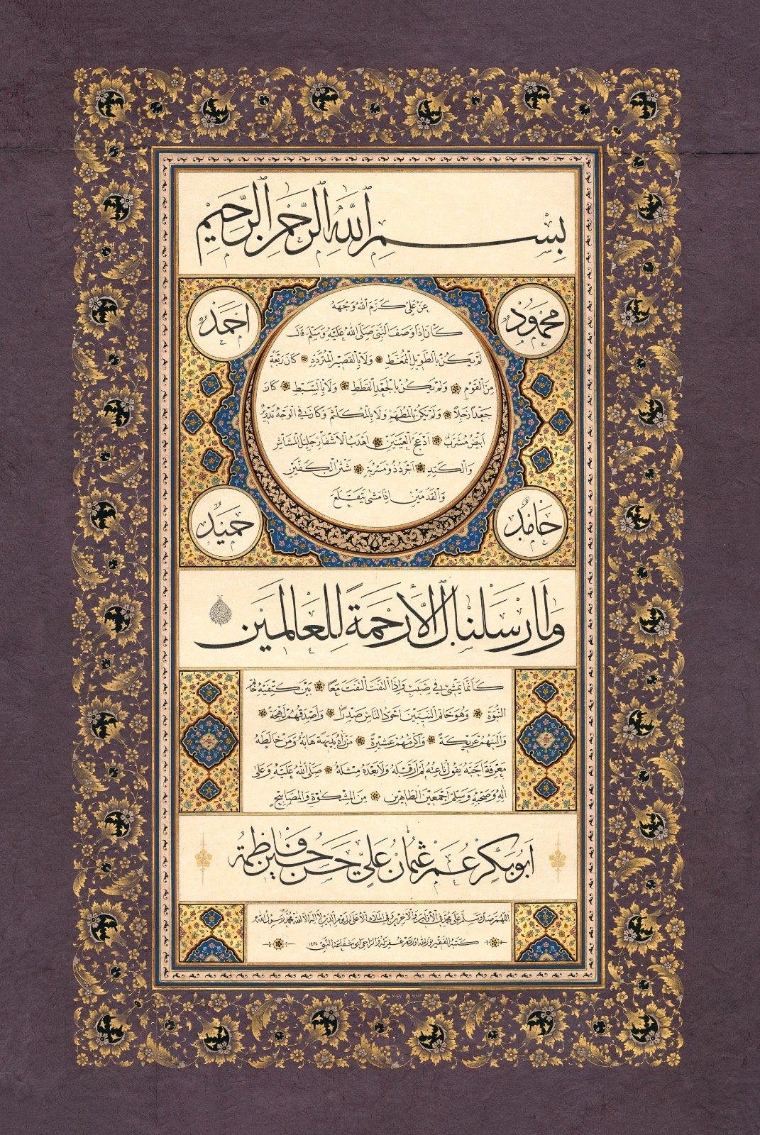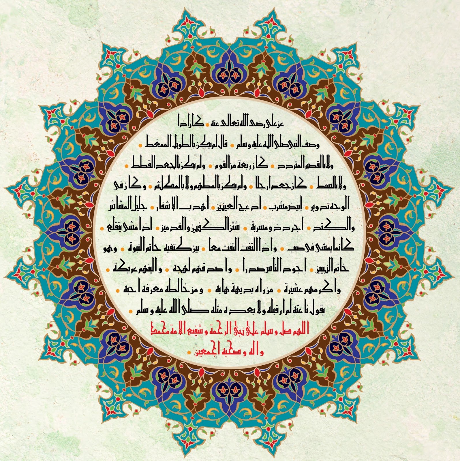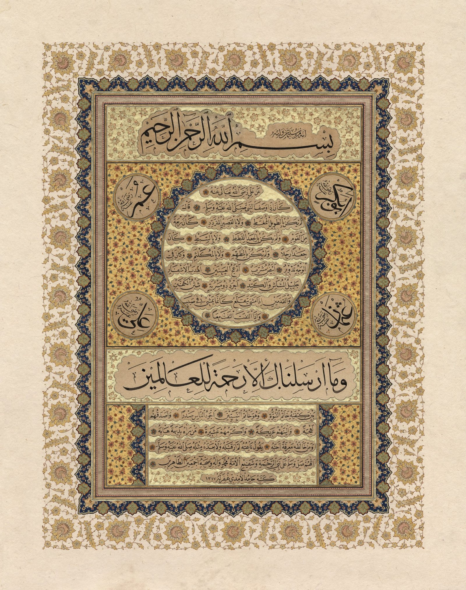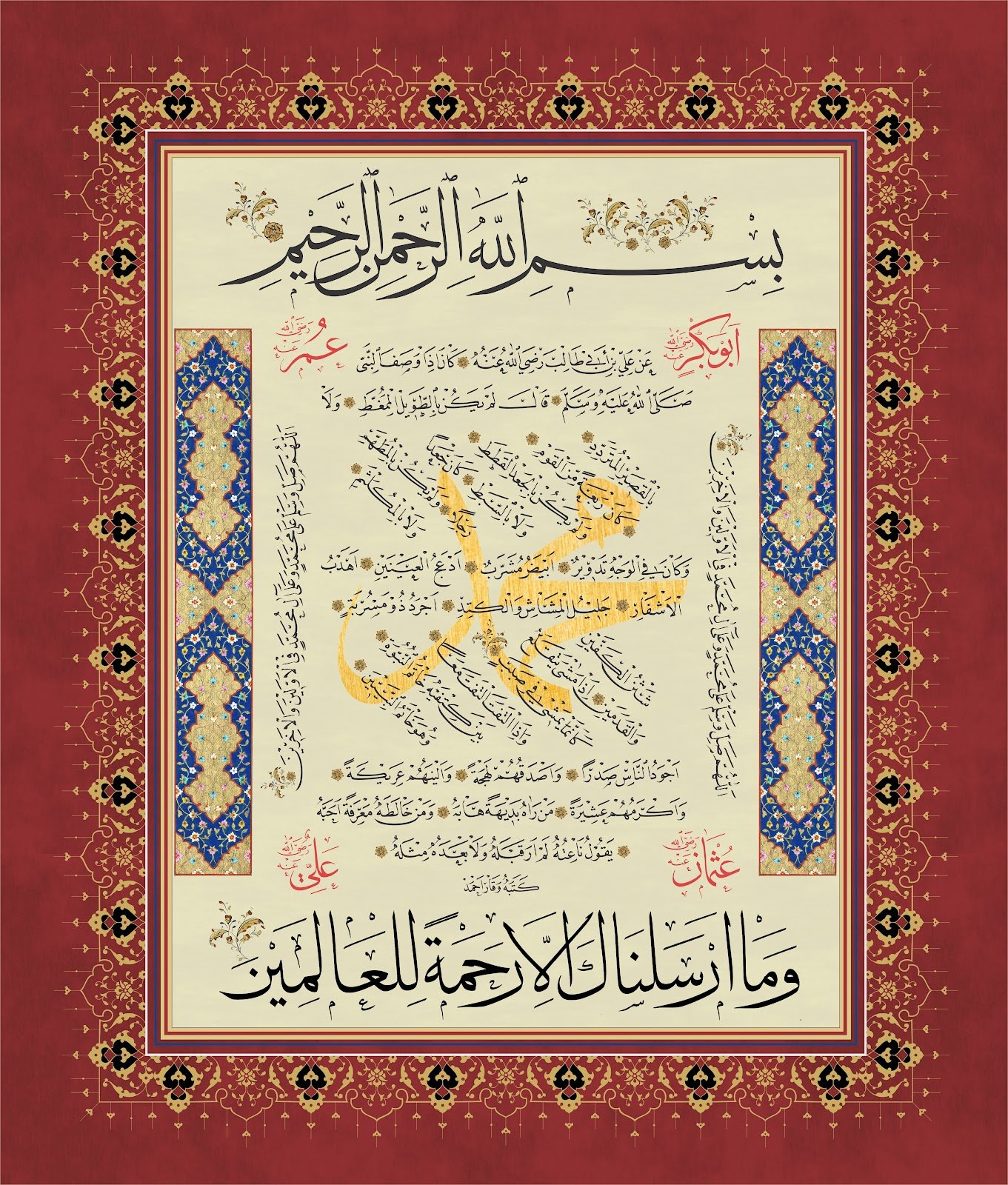 Description: A bright and illuminating piece like the luminous character of the Prophet PBUH. This piece brings a soothing, refreshing feeling to the heart. The Hilye in Tuluth script is surrounded by the names of the four Caliphs and there is heavy illumination all around.