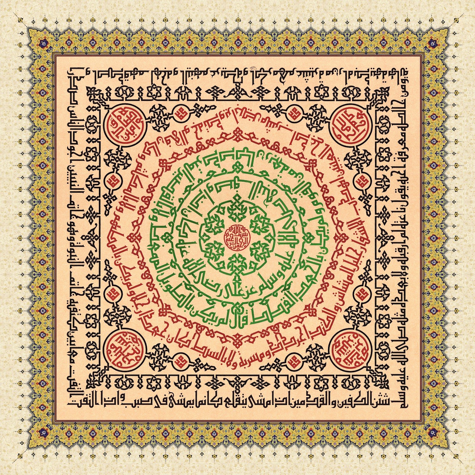 Description: Quranic verses in the middle circle praising the Prophet “Indeed We have sent you as a witness and a bearer of good tidings for the believers and a warner, a caller to God by His permission and an illuminating lamp.”