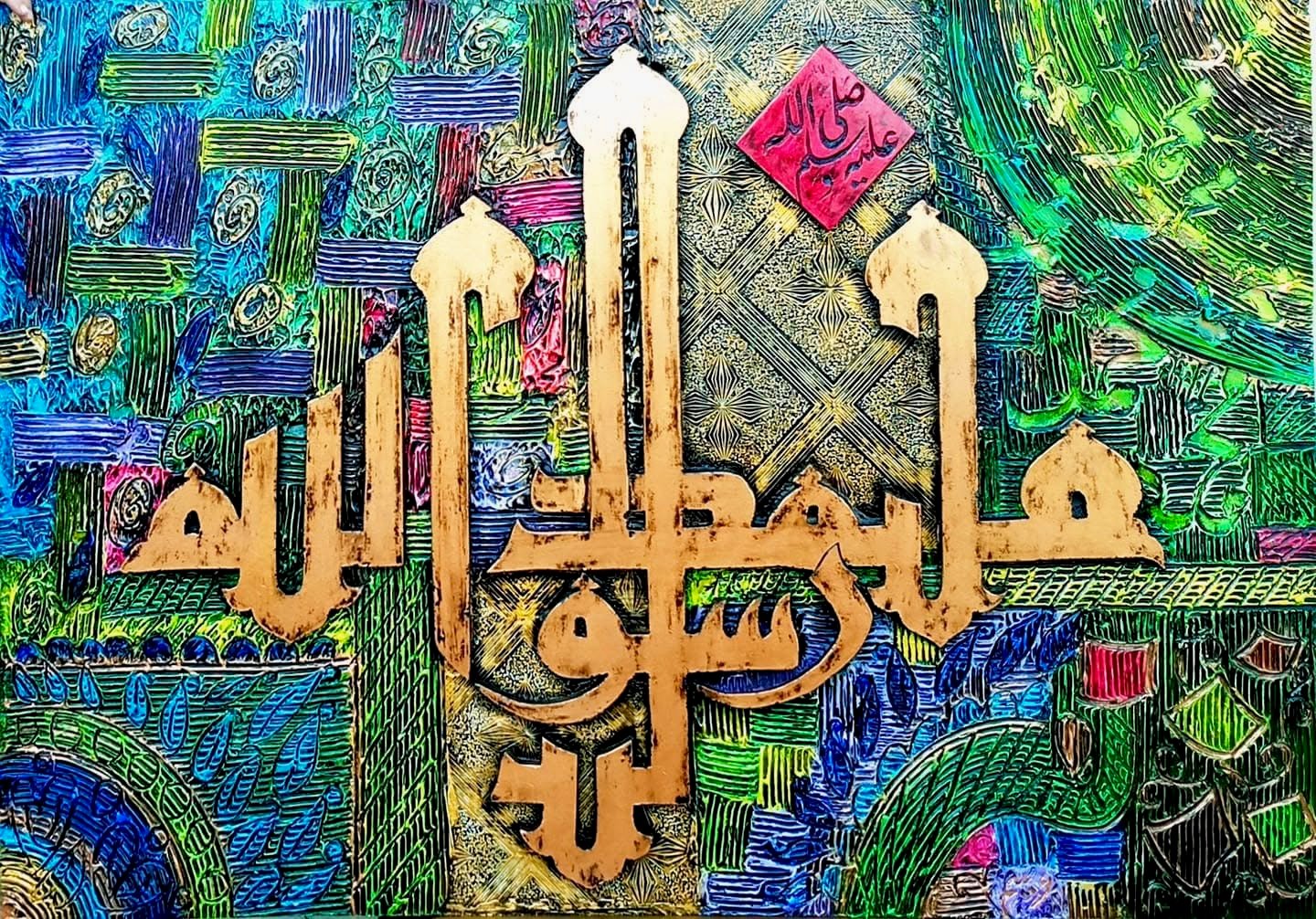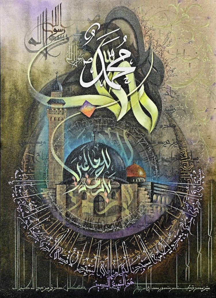 Description of artwork: The painting is titled *”Muhammad Rasool Allah (Ya Rahmatul Lillaalmeen)”* and measures 36×48 inches.