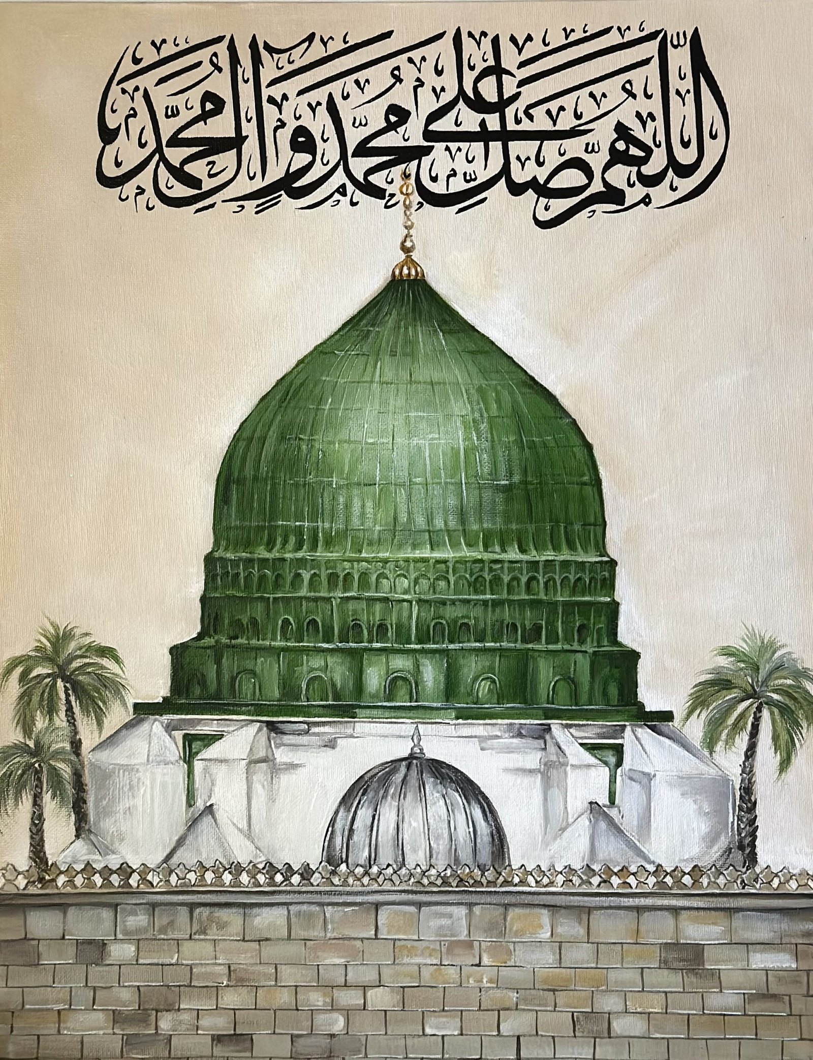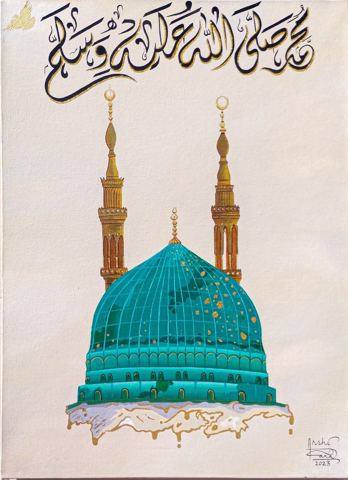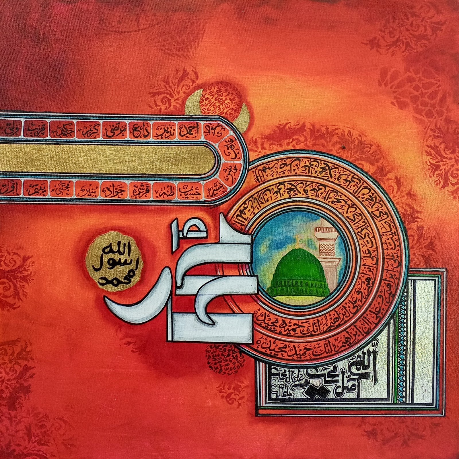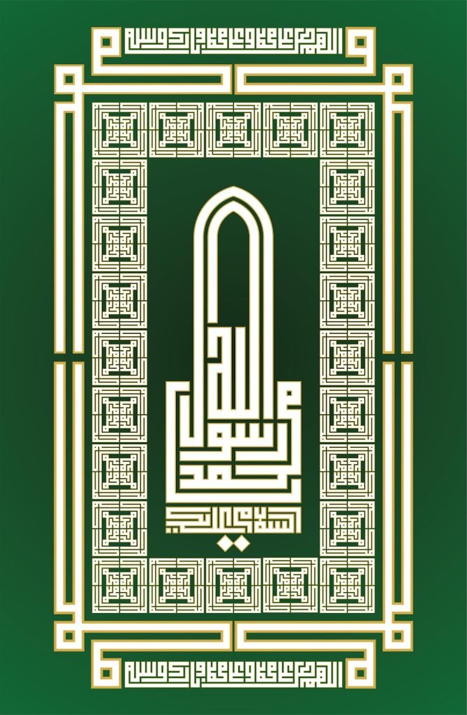 The central part is composed of Salaam on Prophet Mohammed (saw), which is bordered by Prophet Mohammed’s (PBUH) Name, i.e., ‘Mohammed and Ahmed.’ The names are composed to form a tessellation and create a geometric border around the central calligraphy piece. Further, the name Mohammed is mirrored vertically and horizontally at four corners & to complete the work, the top and bottom portions are adorned with Salawaat. I have tried to incorporate principles of Islamic geometry in the work using square kufi script. The color palette, too, is inspired by Masjid u Nabavi.