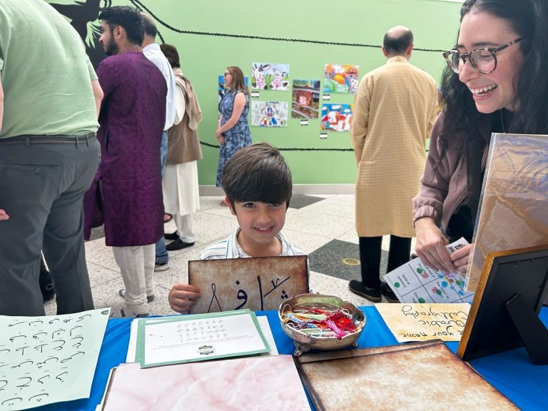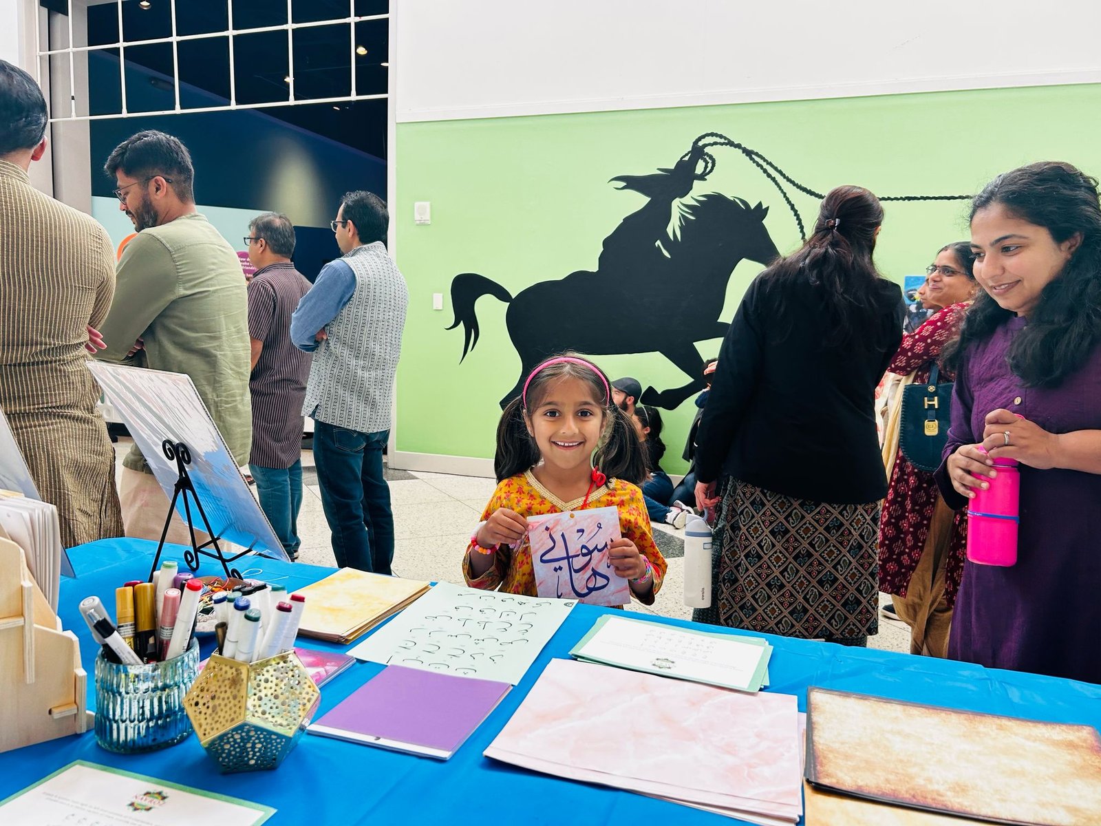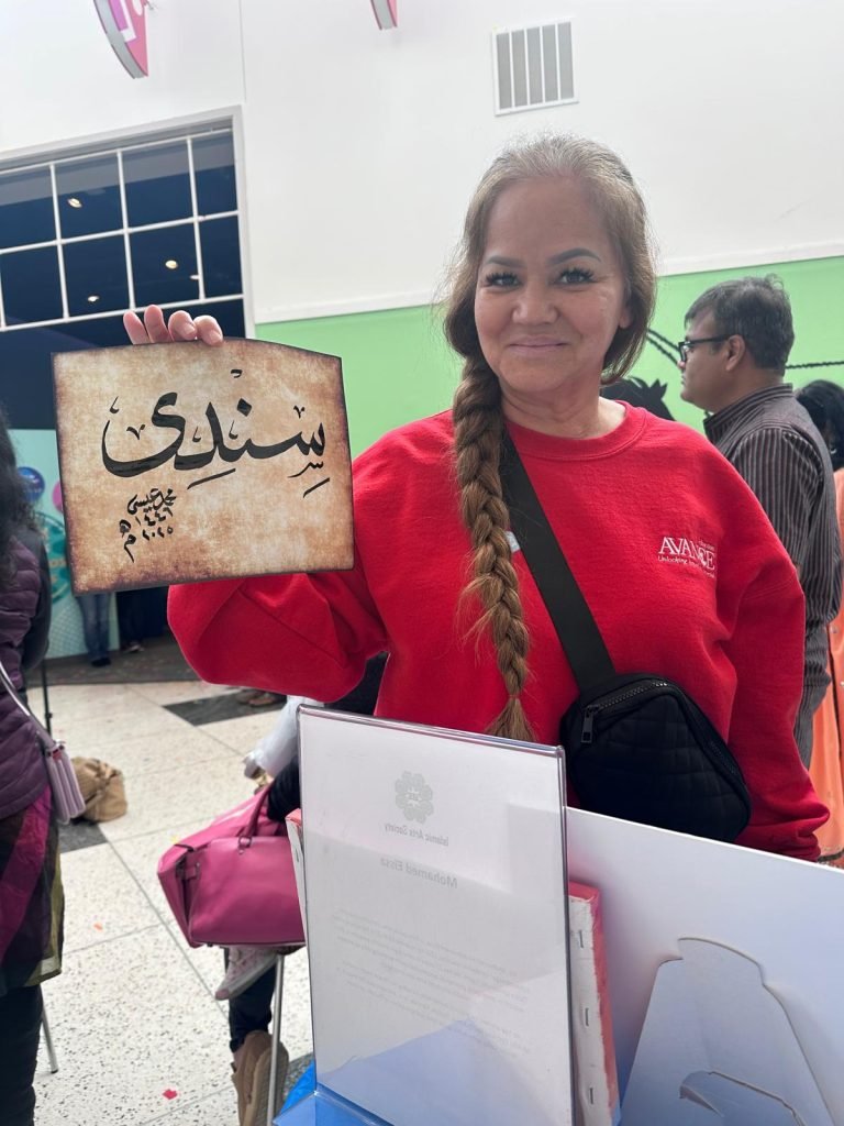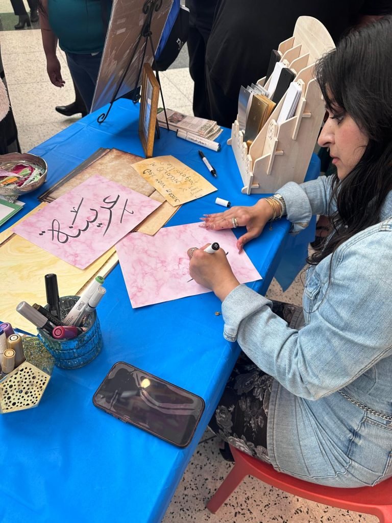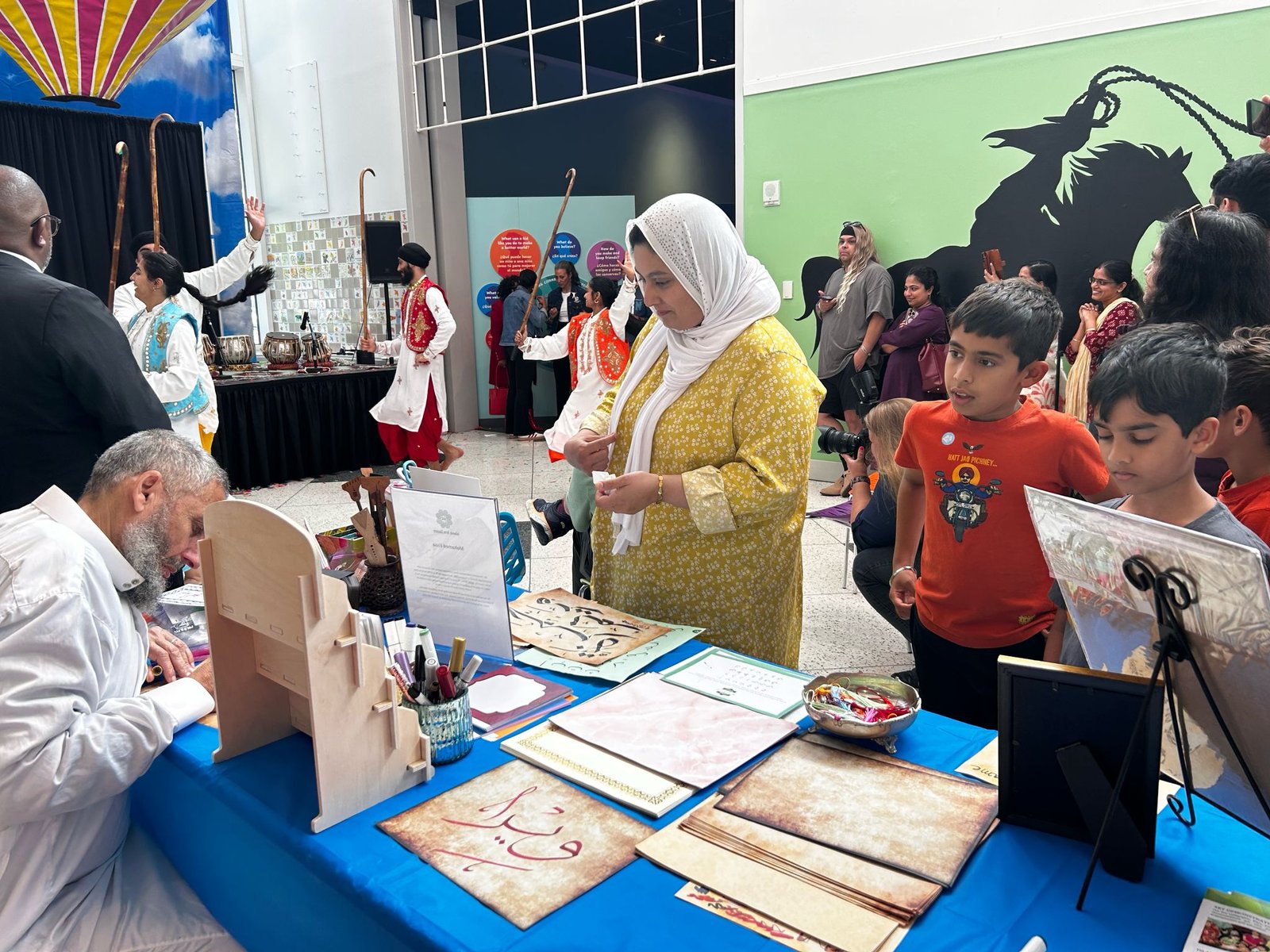The calligraphy corner was central to the stage attraction and guest appreciated becoming familiar with the Arabic language as well as the Islamic culture with getting their own personalized names written. The event was followed with a beautiful ribbon cutting, along with wonderful speeches from curators of the exhibit, Punjabi dances and Tabla and soulful church dance performances. As an amazing addition, we are happy to highlight the rich tradition of Islam through calligraphy so appreciated by the big crowd of guests that visited our table all through out the day leading up to and after the opening ceremony.