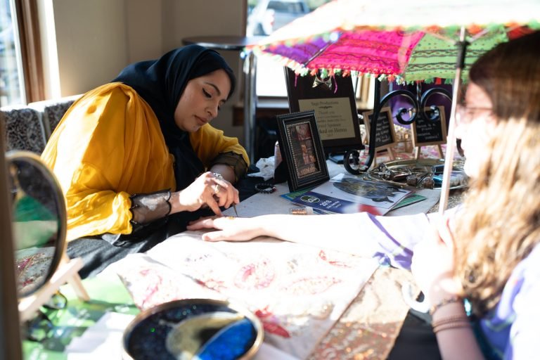 Our team displayed the pieces of Islamic art, and Calligrapher Mustafa Younuszad wrote the names of guests in Arabic calligraphy. Henna artist Zohra decorated the hands of visitors with henna tattoos. The IAS program display was the center of attraction at this event.