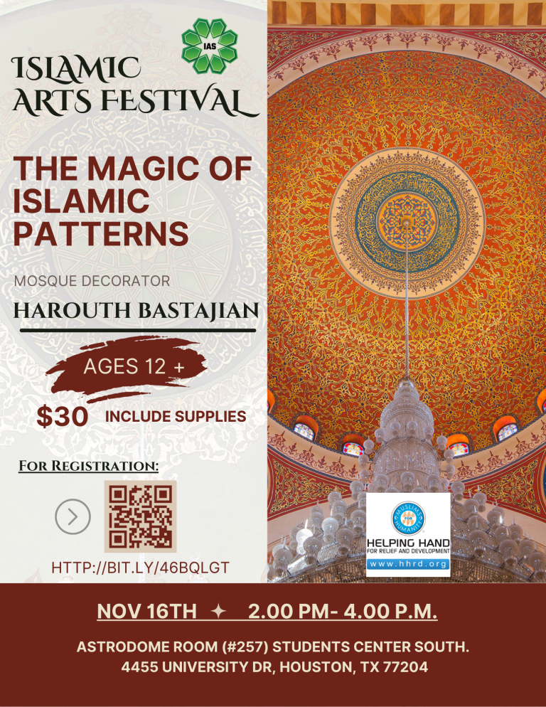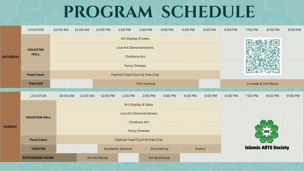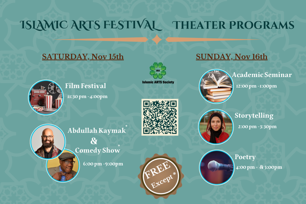 We are excited to offer you a variety of programs at the 12th annual Islamic Arts Festival. Be sure to check our art displays, live art demonstrations, and meet with internationally recognized artists. Attend art workshops, listen to academic seminars, enjoy storytelling, watch films, and participate in the Poetry program. And most importantly, enjoy the free Chai & Qahwah, it’s on us!