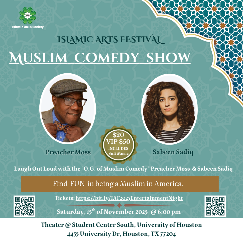 Laugh out loud with Preacher Moss and nationally acclaimed comedians during the comedy hour at the 12th annual Islamic Arts Festival. This show centers around the best of being a Muslim in America. This exclusive show is coming to Houston for a night of family fun. Find the humor in being a Muslim in America. Relax, smile and have a fun time!