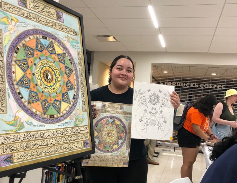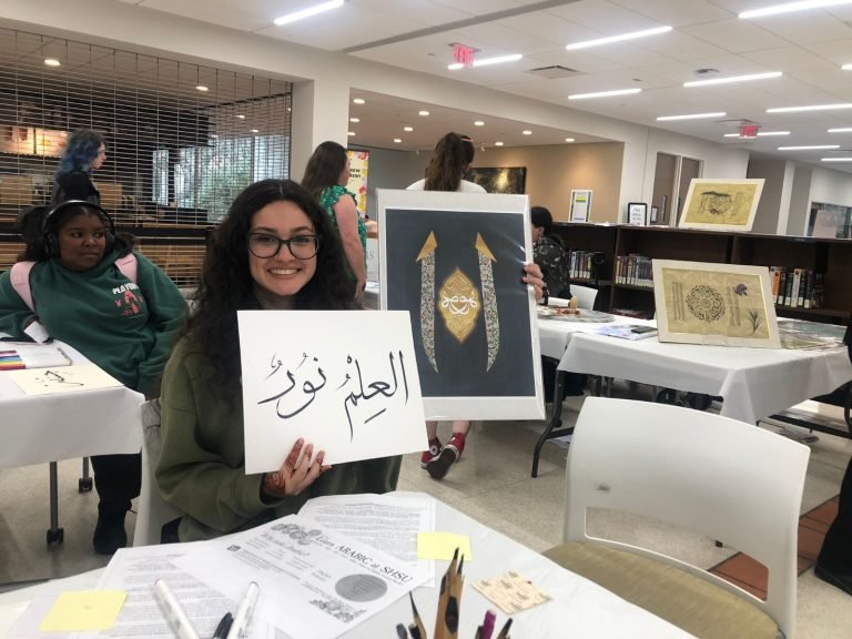 The Islamic Art Society arranged an Islamic art exhibition and art activity day, at Sam Houston University on the seventh of March as part of the Arab and Muslim culture week. The event was attended by many university students who learned about Islamic Arts, traditions, and culture. We wish to thank the Sam Houston university, and Dr. Samar Zahrawi for arranging this event. The event was part of the Islamic Arts Society’s “Building Bridges ” program.